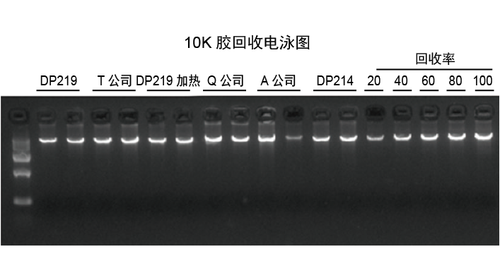试剂盒以及竞品回收不同长度DNA 片段结果。50 μl 洗脱,3 μl 上样。
