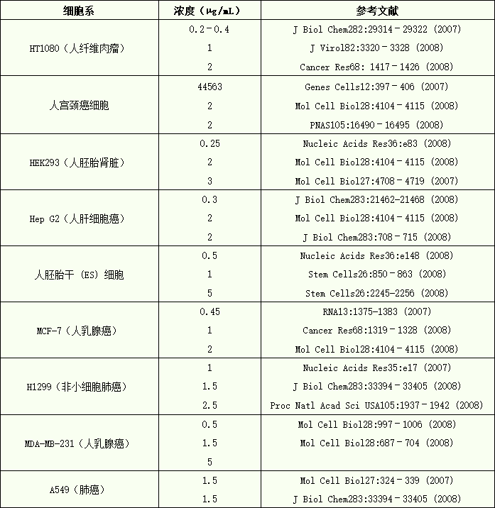 嘌呤霉素(Puromycin)是一种由白黑链霉菌产生的氨基苷类抗生素。其可以打乱核糖体上的肽转运,造成翻译过程中不成熟链终止,从而抑制蛋白质合成。在原核和真核细胞中,嘌呤霉素都是强效翻译抑制剂。链霉菌中的嘌呤霉素N-乙酰转移酶基因(pac)可使机体对嘌呤霉素耐药。嘌呤霉素作用迅速,在低浓度下即可快速导致细胞死亡。贴壁哺乳细胞对浓度为2-5 µg/mL的嘌呤霉素较为敏感,而悬浮细胞对浓度低至0.5-2 µg/mL的嘌呤霉素已经很敏感。对嘌呤霉素稳定耐药的哺乳细胞可在一周内生成。