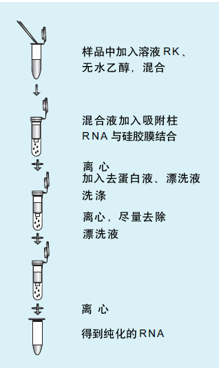 本试剂盒使用独特的离心吸附柱,在高盐条件下RNA与硅胶吸附膜高效、专一地结合,同时除去蛋白质、无机盐离子和许多有机杂质等,在低盐条件下,RNA被洗脱。可处理的RNA样品量为20 μg。