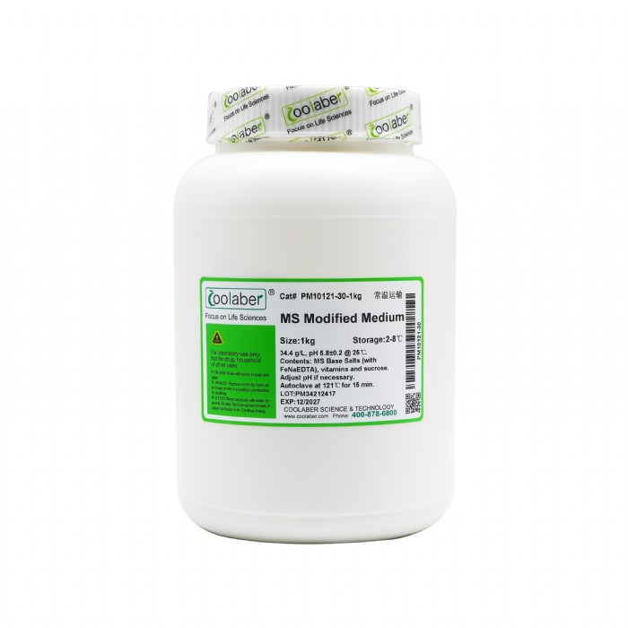 Coolaber推出的改良MS培养基,包含大量元素、微量元素、维生素(有机物)、蔗糖,在遵循通用配方的基础上加以改良。突出表现在免调pH值。Coolaber出品的MS培养基pH值已调整到5.8±0.2,可以省略调pH这一步。独立包装省却称量,0.5L/袋(每袋约17.2g,能配0.5L的培养基),只需剪开包装,加水,高温高压灭菌就行了。也可定制包装如1L、5L/袋等。Coolaber出品的MS加入螯合铁(EDTA铁钠盐)替代传统配方亚铁盐。既有利于植物吸收,又有利于培养基的保存。